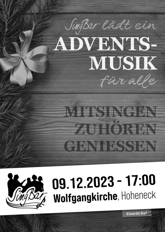 Am 9. Dezember 2023 um 17:00 Uhr läd Euch SingBar ein, mitzusingen, zuzuhören oder die besinnliche Adventsmusik einfach zu genießen in die Wolfgangkirche Hoheneck.