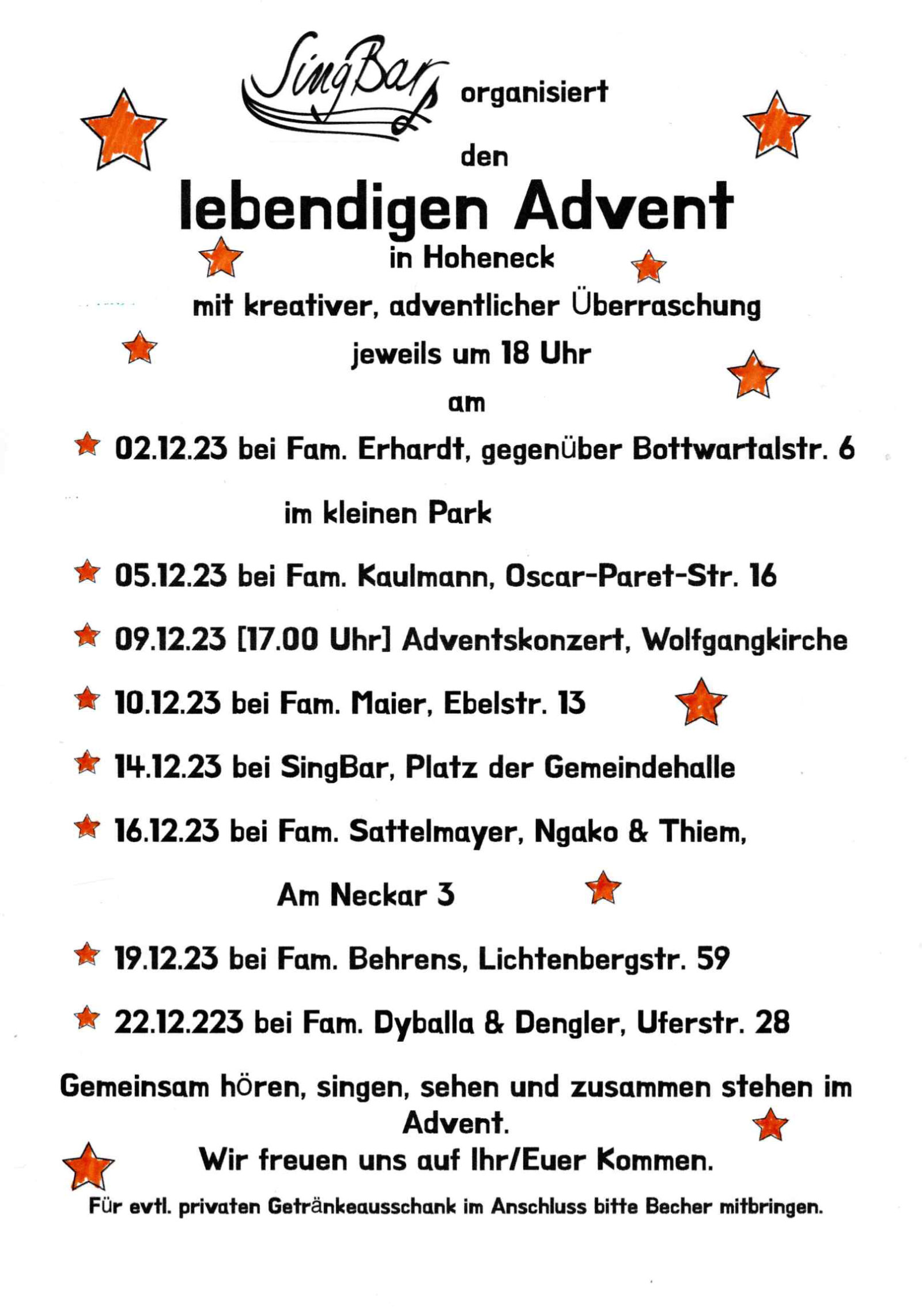 Unsere SingBar organisiert den lebendigen Advent 2023 in Hoheneck
