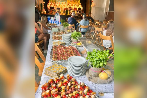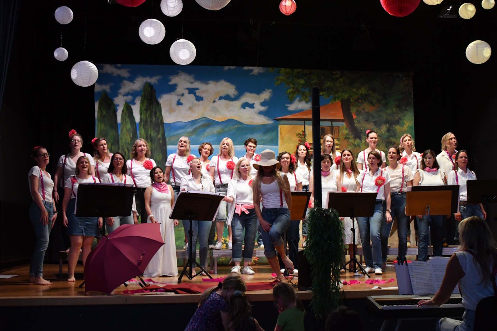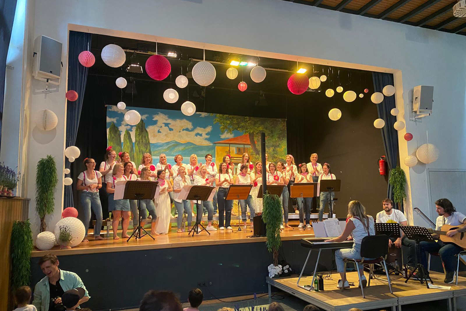 Der KSV-Chor SingBar verwöhnte seine Gäste am Sonntag, den 16. Juni 2024 musikalisch und kulinarisch auf seinem Sommerkonzert, an dem nichts aus der Konserve kam. Das kreative Frauenteam verwandelte die Gemeindehalle Hoheneck in eine italienische Piazza mit vielen kleinen Sitzgruppen, einer Bar, einem italienischen Buffet, Lampions und Lavendelpflanzen – und sie montierten eine riesige Bühnenbildleinwand mit einer südländisch anmutenden Dorfansicht, die sie im Fundus des Vereins ausgegraben hatten. Es war das perfekte Setting, um ihr Repertoire stimmungsvoll und einzigartig in Szene zu setzen.