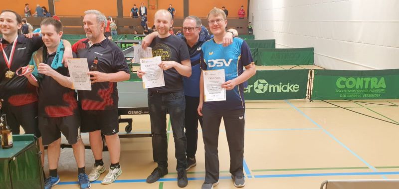 Im Halbfinale gegen Pleidelsheim setzte es ein 2:4 – noch war nichts verloren. Das Spiel um Platz 3 ging dann leider deutlich mit 1:4 an Asperg, also blieb am Ende der undankbare vierte Platz – man könnte sagen: knapp an der Medaille vorbei geschmettert. Aufgeschlagen und durchgezogen haben Jonas Lassen, Harald Weiler und Thomas Koczan – danke für euren Einsatz!