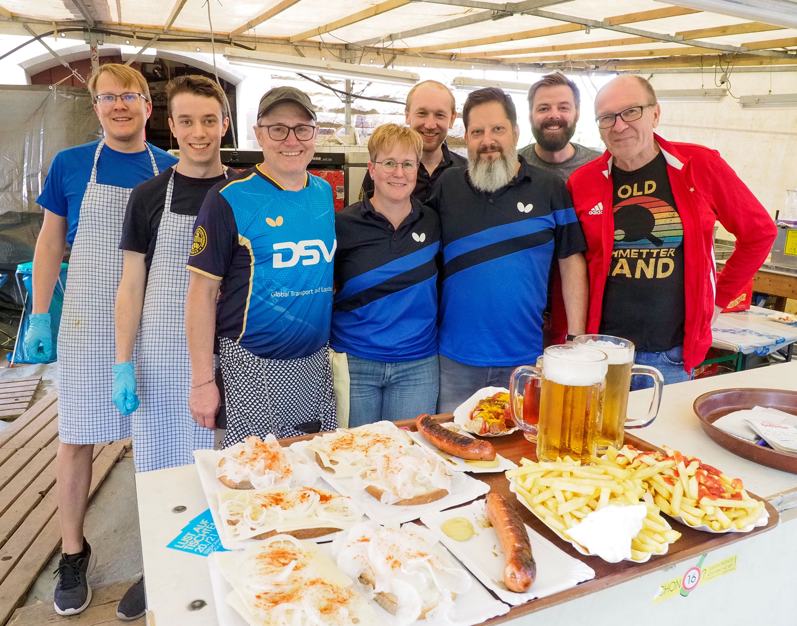 Sonntag Punkt 9 Uhr stehen die ersten Tischtennis Freiwilligen beim Weinberghaus Rapp bereit, um die Nachtwache der Fußballer abzulösen. Die Arbeitsbereiche werden gesäubert, Gläser gespült, Rettich gehobelt um Rettich/Käse-Brot vorzubereiten, frische Brot und Brötchen vom Bäcker hygienisch verstaut, Grill und Fritteuse für Pommes & Currywurst vorbereitet und vieles weitere zum Wohl der Gäste getan.