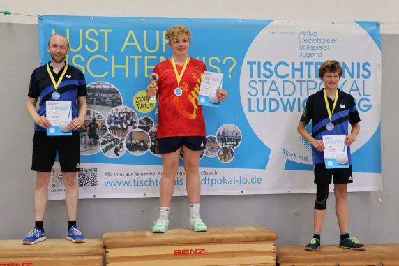 In einem top-besetzten J19 A-Klasse Feld konnte sich Laurin Rommel den Stadtpokal 2025 erkämpfen. Gegen Jakob Krestin gewann er das Finale mit 3:0 Sätzen. Was nach eine klaren Sache aussah, war es ganz und gar nicht. Vom Viertelfinal bis zum Finale warteten nur extrem schwere Gegner. Hierbei die Konzentration hochzuhalten und auch enge Begegnungen zu gewinnen war eine Meisterleistung. Am Ende steht der hochverdiente Gewinn des Wanderpokals. Jan Mindner holte sich im kleinen Finale Platz Drei im Spiel gegen Arne Tempelmann vom TV Aldingen mit 3:1.